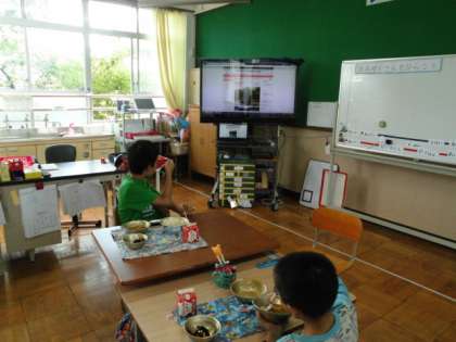 と6年生は去年の花背山の家を思い出しながら,給食時間にみんなでホームページを確認しました。