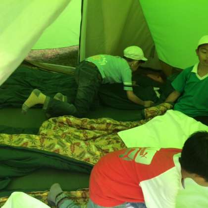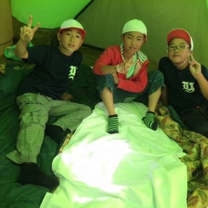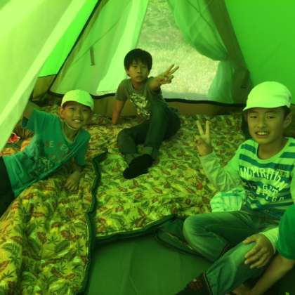 テントの中で、「思ったより大きいね」「何処で寝る?」などと言いながら、みんなとてもご機嫌です。男子は去年のみさきの家では雨でテントで寝てないそうです。テントデビューです。今晩、しっかり寝てね!