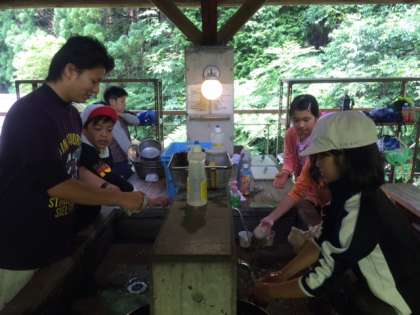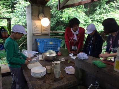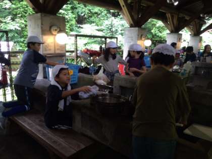 今日の昼食は2回目の野外炊事です。バイキングをします。豚汁、クリームシチュー、ハヤシライス、焼きそばです。準備もスムーズです。