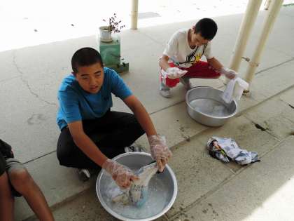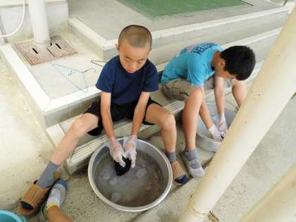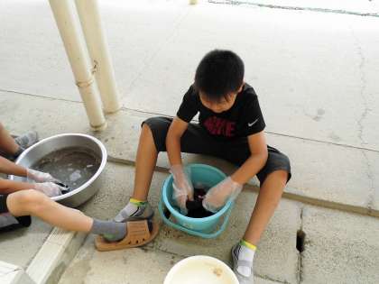 おけの水が濁ってきて、汚れが落ちていることを実感していました。。