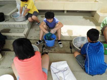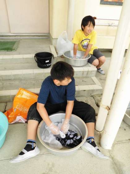つまみ洗いで汚れが落ちると、とっても嬉しそうな6年生。