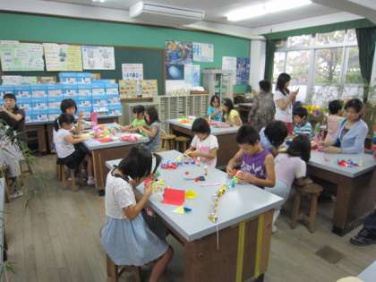7月最初のサタデースクールは、「七夕かざりをつくろう」でした。もうすぐ七夕になる7月4日、大きな笹にたくさんの七夕飾りをつけました。中にはおりがみをたくさん使ってつくらなければならない大作もあり、苦労しながらもきれいな作品を作っていました。短冊に願いごとを書いて、うれしい七夕を迎えることができそうです。地域の皆さんありがとうございました。