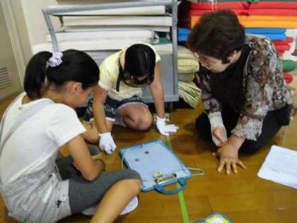 また、サングラスをかけて軍手をはめた状態で,財布から小銭を出すという体験もしました。子どもたちは,目が見えにくいのと指先がうまくつかえないのいうことで,とても掴みにくいと実感していました。