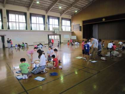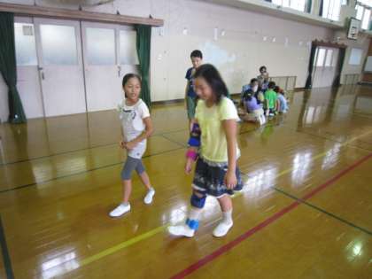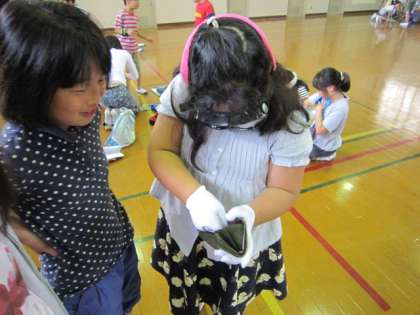4年生は総合的な学習の時間に、福祉教育の一つとして「認知症」について学びます。今日は、高齢者の皆さんが普段どのようなことで不自由を感じておられるかを疑似体験しました。手袋をはめたり、サングラスをつけたりしながらお金を財布から出したり、たくさんのサポーターや重りをつけて歩いてみたりしました。子どもたちは、不自由さを感じ取り、相手の立場になって考える第一歩を踏み出したところです。