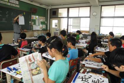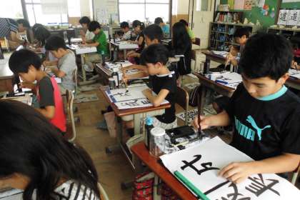 見本を見ながら集中して書いている子,筆を入れる場所をよく考えながら書いている子,子どもたちそれぞれが気持ちを集中させている姿が見られました。