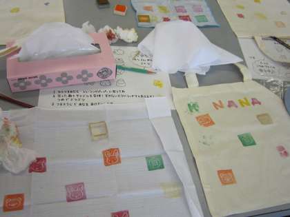 消しゴムではんこを作って,そのはんこを使ってデザインした袋が,作品となります。もともと合った消しゴムはんこと,今日作ったオリジナルなのとで,デザインを考えました。消しゴムは,竹串で,ゴリゴリとすると溝が作れるので,安全にできました。消しゴムはんこもお土産となりました。