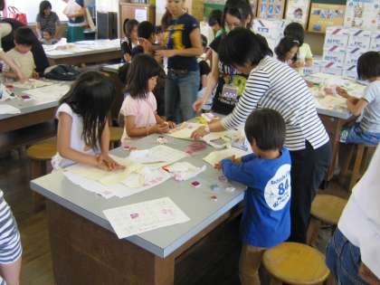 消しゴムはんこ作りのサタデースクールは,同志社大学の学生支援課が運営している「でまち家」に来る学生のボランティアで,進められました。