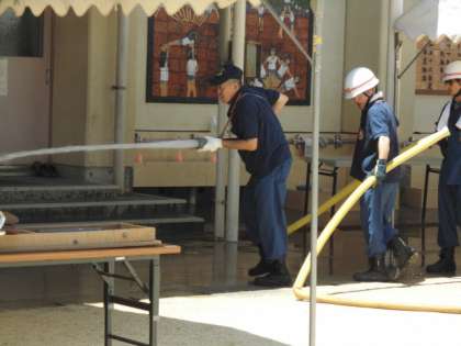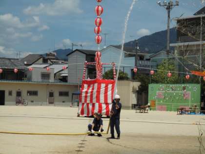 準備がひととおり終わったところで、消防団の皆さんが、運動場や渡り廊下に水をまいてくださいました。