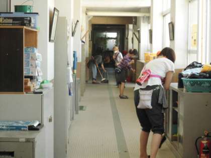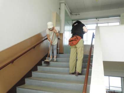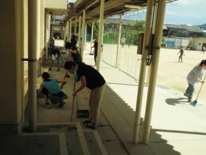 校舎の廊下や階段と体育館の掃き掃除やモップかけそして、渡り廊下も掃いてくださいました。夏まつりが晴れていたので、土がたくさんあがるということはありませんでしたが、日頃子どもたちの手できれいにしきれなかった分も合わせて大人の皆さんでお掃除していただいたので、ピカピカになりました。ありがとうございます。