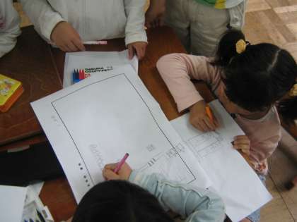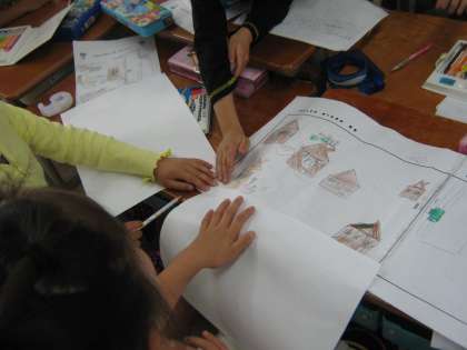 家の周りの様子を絵地図にしているところです。「ここらへんにコンビニがあったよ」「○○ちゃんの家が入らない〜」「紙をつけたそうよ」子どもたちのやりとりを聞いているとどんどん新しいアイディアを出していて,「町たんけん」への関心・意欲の高さを感じます。まずは,どんな地図ができるか楽しみです。