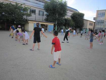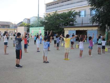 ラジオ体操,後半の部が始まりました。昨日は雨の為,中止になりましたが,今日は学校にも多くの児童が集まりました。すこし眠そうな子どもたちもいたような気がしますが,元気な様子でした。今週金曜日からは授業が始まります。規則正しい生活を送るようにしましょう。