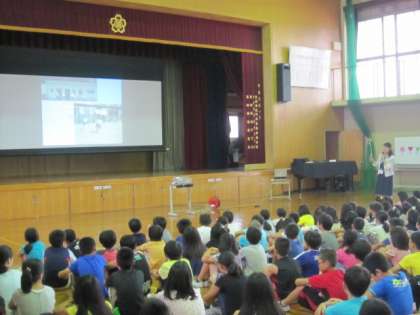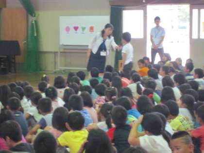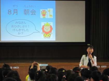 夏休みが終わり、いつもの年より少し早い始業日です。朝会では、校長先生から、夏休みにがんばっていた子どもたちの紹介がありました。ラジオ体操に欠かさず来た子。暑い日も陸上をがんばっている6年生、水やりをする2年生。そして、夏休み前に約束していた本との出会いを確かめられました。最後に、これから毎週金曜日を「イングリッシュ フライデー」として、英語でいろいろな人とあいさつする日にしていくことを話されました。次の金曜日から、子どもたちがいっぱい英語を使ってくれるか楽しみです。