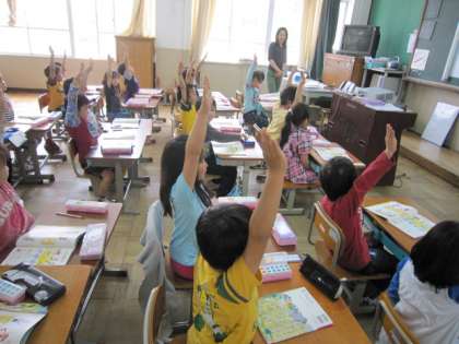 一つ目は,「黙って挙手する」ということです。質問に対して,「はい,はい」と声を出すことは,思考中の子どもの妨げになるからです。