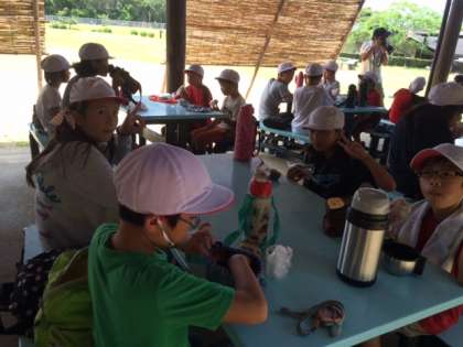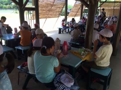 ここで昼食です。朝から作っていただいた心のこもったお弁当。あっという間に、食べ終わった子も。食べ終わったあと、かさが小さくなるようにと、工夫して持って来た子もいます。朝から、お家の皆さん、ありがとうございます。