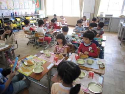 全員の子どもたちが挙手しました。落ち着いた雰囲気の中で,生活班のお友だちと会食する楽しさ,みんなで食すると美味しさも倍増するようです。