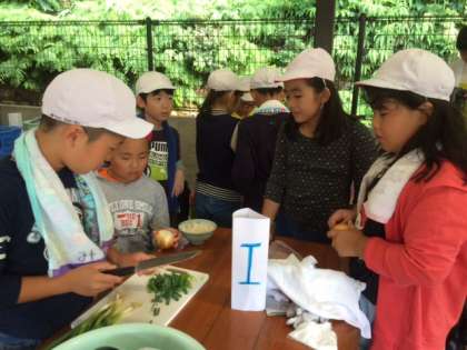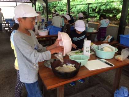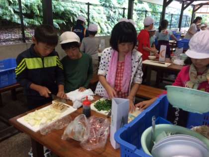 宮崎浜に石を拾いに行ったので、少し時間が遅くなりましたが、野外炊事を始めました。材料を切っています。