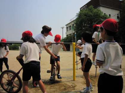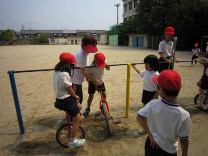 周りの子どもたちも,一輪車に挑戦する姿を見つめながら,心の中で「頑張って!」と応援しています。