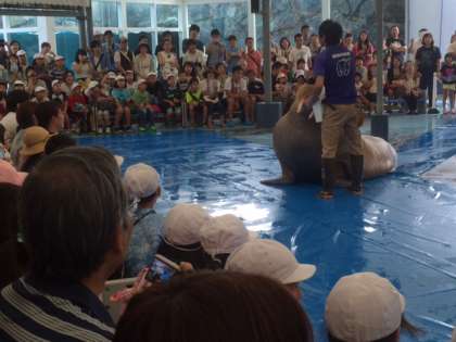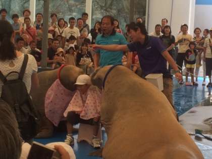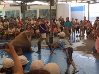 輪投げをするお手伝いに選ばれた子がいます。セイウチからプレゼントも!ラッキーでしたね。