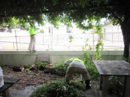 今日はビオトープ園芸・作業日でした。夏休み前・夏休み中もこまめに作業をしていただいていたのですが,少しの間に木も成長し,雑草もいたるところに生い茂っていました。蒸し暑い中、除草やみかんの摘果などの作業をしていただきました。本当にありがとうございました。