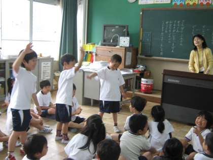 今日は音楽にあわせて,振りをつけて踊りました。テンポが速くなったり遅くなったりするのにあわせて,振りの動きも変わります。
