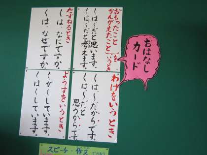 話型の掲示し,うまく話せていないとき,話をする時には必ず活用します。そのうちに話型が身につき,いろいろなときに,正しく話ができるようになります。