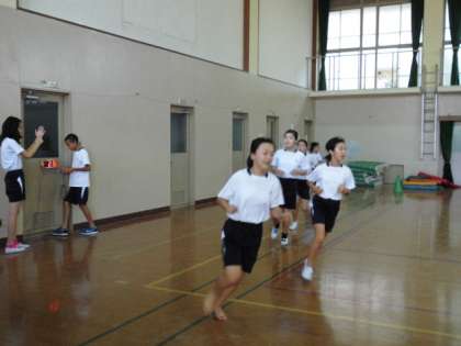 体育館をのぞいたら、6年生が大文字駅伝めざして、がんばって走っていました。