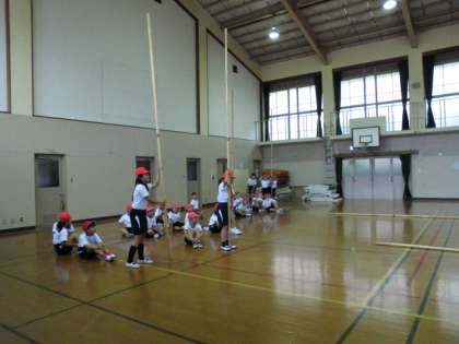雨が降っていたので、体育館で棒引きの練習です。