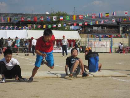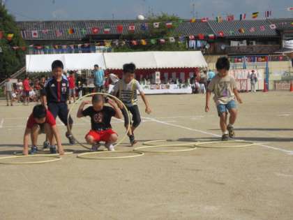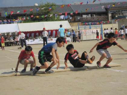 区民運動会の最初のプログラムは、子どもたちによる、障害物競走。輪をくぐったり、前回りをしたりするなど、体を上手に動かしてがんばっていました。学校の運動会とはまた少し違う、リラックスした部分もありますが、走り出せば全力です。やる気が見ているこちらにも伝わってきました。