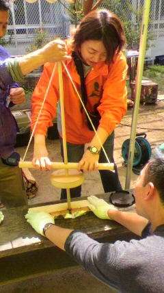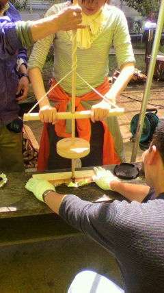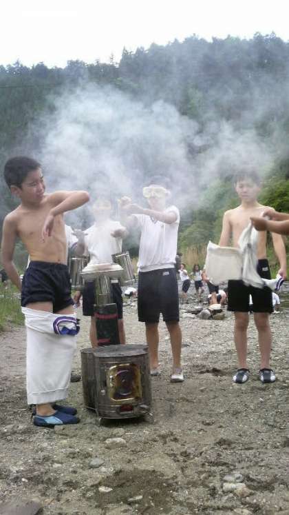 火おこし体験。説明を受けて,汗だくになって,火おこしをしました。煙は出るものの炎になるのには,時間が必要です。