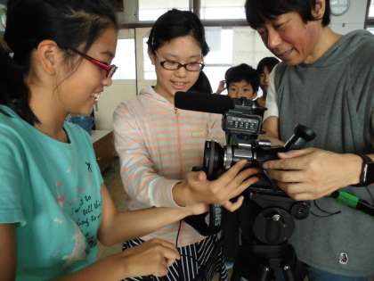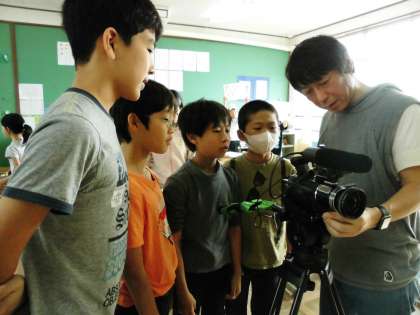 カメラ,音声の担当の子どもたちは使い方の説明を真剣に聞いていました。
