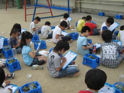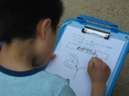 今日は、あさがおの芽の観察をしました。葉っぱをよく見ると,線が入っていたり,くきの下のぶぶんが少し紫色になっていたりしていました。よく見て,かくことができました。
