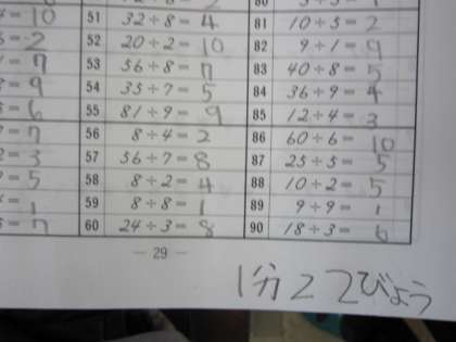 まず,わり算を学習していますので,90題の問題を,時間との勝負で,やり遂げます。1分台の子どもが多数いました。