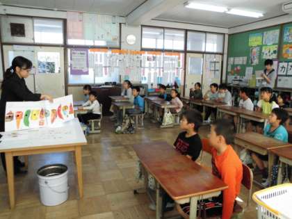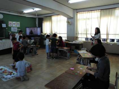 3の2は「友達のチョウを集めよう」で絵本の読み聞かせやゲームを通して、曜日や食べ物の表現に慣れ親しみました。