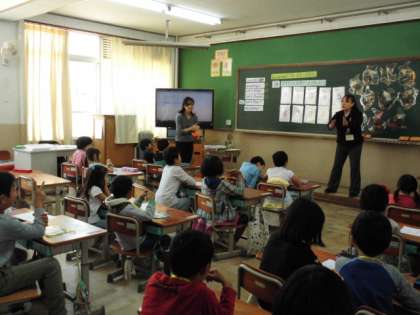1の1は「リースをつくろう」でゲームを通して10までの数の言い方に慣れ親しみました。英語ボランティアさんにお世話になりました。