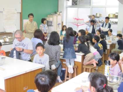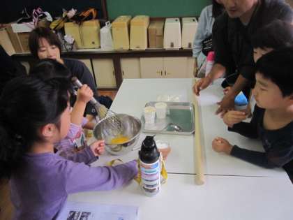 まず、最初は生地づくり。初めて卵を割る子はドキドキしながらも、上手に割っていました。大きなボールに小麦粉を入れて、しっかり混ぜたら出来上がりです。