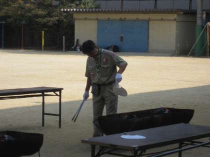 今日のサタデースクールは、「バームクーヘン作り」です。この取組は今年で3回目。年を追うごとに参加者が増えて、今日は大人と子供を合わせて約60名の参加がありました。朝早くから、炭をおこして、準備をしてくださいました。