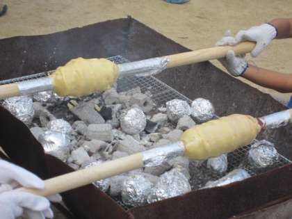 どんどん回しながら、続けていると、原始人の食べていた骨付きのお肉のような形になってきます。焼き色がつけばまた新しい生地をつけます。そろそろなん層もの重なりができてきました。