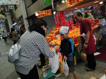 果物屋さんでは「いらっしゃいませ」,「おいしい大きなかきがありますよ」とアーケードにひびきわたる大きな声を出して頑張っている子もいました。