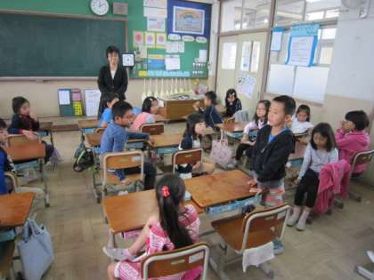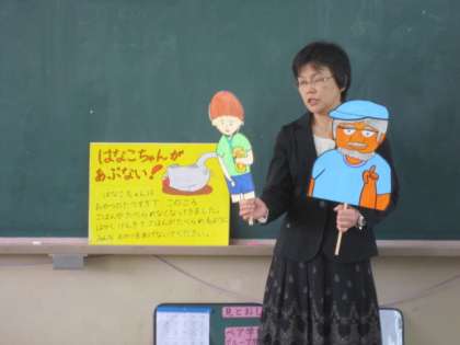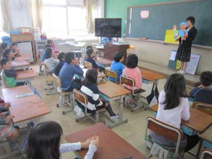 栄養教諭の先生から、年に2回、食のあり方についての学習、「食の学習」をしていただきます。今日は2年生が、おやつと食事について学びました。紙芝居や、ペープサート等をうまく使って、楽しく指導してくださいます。子どもたちもとても楽しみにしています。