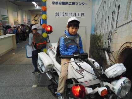 白バイに乗っている子どもたち。白バイを初めて見る子どもも多く,興奮しているようでした。乗る時は順番交代に乗っていました。当たり前のことですが,さすが4年生ですね。