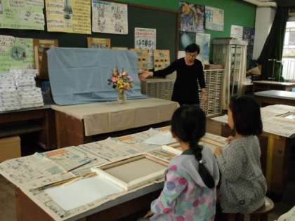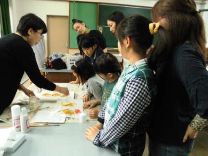 参加者は、少し少ないのですが、逆にそれを活かして、プロがつかうような貝を粉にした画材を使ったり、最初に丁寧に講師の先生より、お手本を見せていただいたりできました。