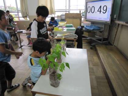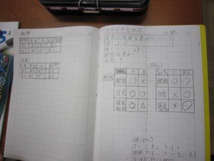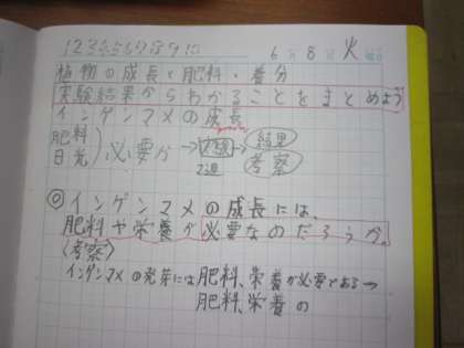 理科の授業では,インゲン豆の発芽の条件を明確にするために,水,日光,適当な温度,肥料が必要かを予想し,実験,観察し,結果を記し,推論して考察し,発芽の条件を明確にしていきます。そのためには,課題,問題,予想,結果を知るための実験,観察の在り方をしっかりとノートに記していきます。考えたことを記述し,明らかになった考えをまとめ,さらに,考えをすすめていきます。