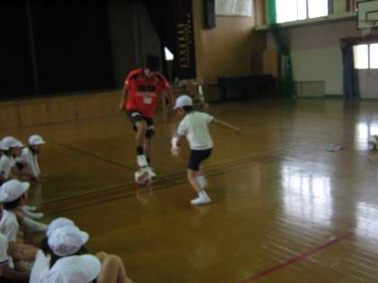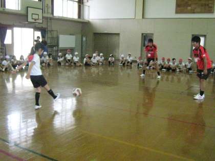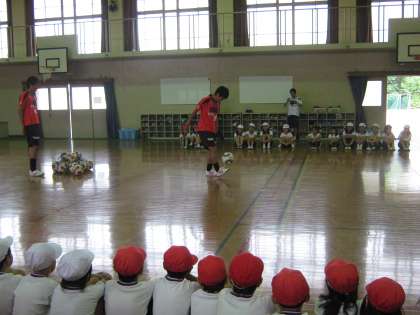 まず最初に,リフティング,シュート,円になってのボールタッチなどを教えていただきました。プロの選手のしている姿を見ながら,「かっこいい!」,「僕もしたい!」,「わたしもしたい!」という声も聞こえてきて,体育館は活気にあふれていました。
