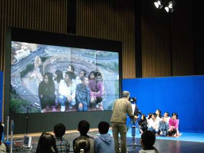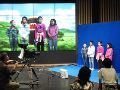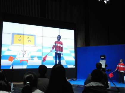 まずは,番組がどのようにつくられているのかを聞いたり,クロマキーの体験をしました。映しているところは青い,なにも描かれていないはずなのに,編集で映った映像を見ると背景が現れる。ちょっと不思議な体験に子どもたちも楽しそうでした。