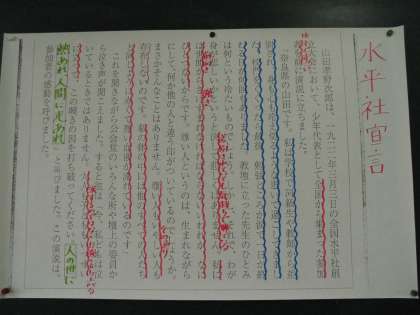 そして、そのころに読まれた「水平社宣言」について学習しました。
