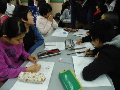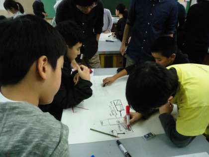 実験方法を考えるにあたって,今日は京都大学の学生の方々にも来ていただき,子どもたちの意見交流の中で,アドバイスをたくさんしていただきました。