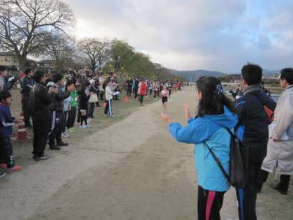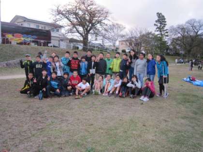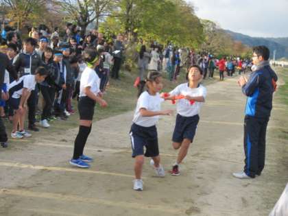 スタートと同時に、第1走者は、すごいスピードで駆け抜けていきました。各校のエースが揃う1区は、どのチームもあまり差がなくレースが始まりました。しかし、次第に上位と下位のチームの差が開き、四錦校も少しずつ離されました。子どもたちは、それでも諦めることなく、自分の力を出し切り、仲間にタスキをつないでいきました。結果は11位でしたが、アンカーまでたすきをつなぎ、最後はその思いから涙があふれてくる子もいました。走った子には、がんばったからこそ感じることのできる、何か得たものがあったはずです。最後は記念写真を、応援してくれた仲間といっしょに撮りました。