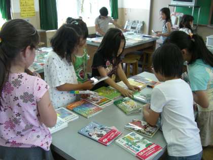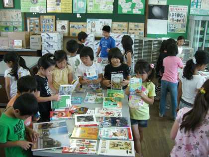 たくさんの新しい本を目の前にして,子どもたちの瞳はきらきら輝きます。物語の本を手に取る子,スポーツ年鑑に見入る子など,一人一人の興味・関心の違いが感じられます。「みんなが選んだ本が,図書室に並ぶんだよ」という声かけに,子どもたちの本選びが真剣になります。友だちがどんな本を選んでいるのかも気になる様子です。選んだ後は,本が早く図書室に並ぶことを楽しみにして教室に帰りました。