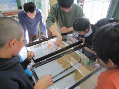実験の方法は、各班それぞれちがったもので、堆積や浸食といった、流れる水のはたらきを自分たちで考えた方法で確かめました。自分で実験道具や砂を触り、自分の目で確かめ、結果をまとめていました。京都大学の皆さんに、たくさんの準備をしていただいたおかげで、大変5年生の子どもたちも意欲的に学習していました。