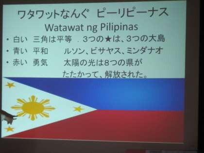 今回の「世界の和輪話」は、フィリピンでした。四錦小には、たくさんのフィリピンからやってきた子どもたちがいます。日本語教室で教えてくださっている、杉山先生がフィリピンの文化を、映像や遊びを通して教えてくださいました。日本人の子どもたちは、文化の違いにびっくりしたこともたくさんあり、フィリピンから来た子どもたちには、懐かしい場面や自分たちの生活に近いことなどがたくさんあったようでした。
